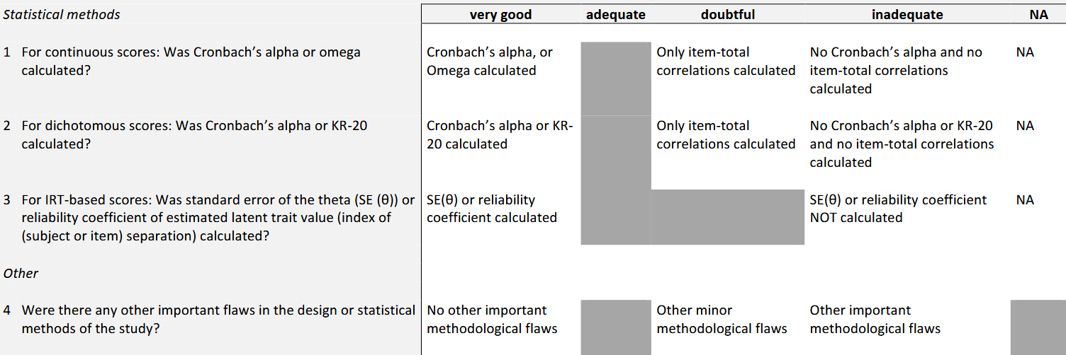 Next, you decide to look closer at the measurement properties of internal consistency and reliability. You use the COSMIN Risk of Bias checklist for this, and first you look at ‘Box 4. Internal consistency’.